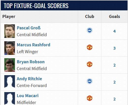 进球方面,双方攻破对方球门次数最多的球员都已经不在阵中。格罗斯曾经在老特拉福德共为布莱顿打进四球,但目前效力于多特蒙德。拉什福德也曾三次攻破布莱顿的球门,目前为巴塞罗那效力。