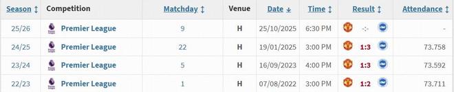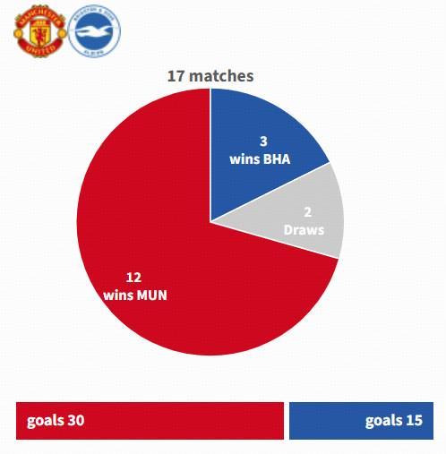 曼联与布莱顿此前在老特拉福德的17次交锋中,曼联12胜2平3负占据明显优势,但前三个赛季布莱顿在曼联主场都能取胜。