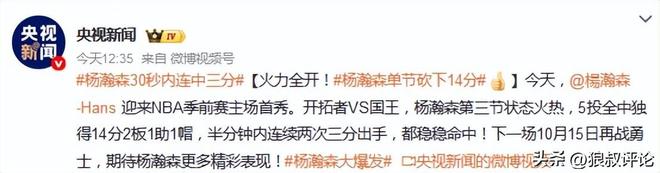 体坛周报记者孟季年表示:第一场面对勇士,杨瀚森发挥不算特别亮眼的原因有很多。生涯第一场NBA比赛,需要适应的过程。勇士阵中又都是老油条,新秀打起来就是不会那么舒服。